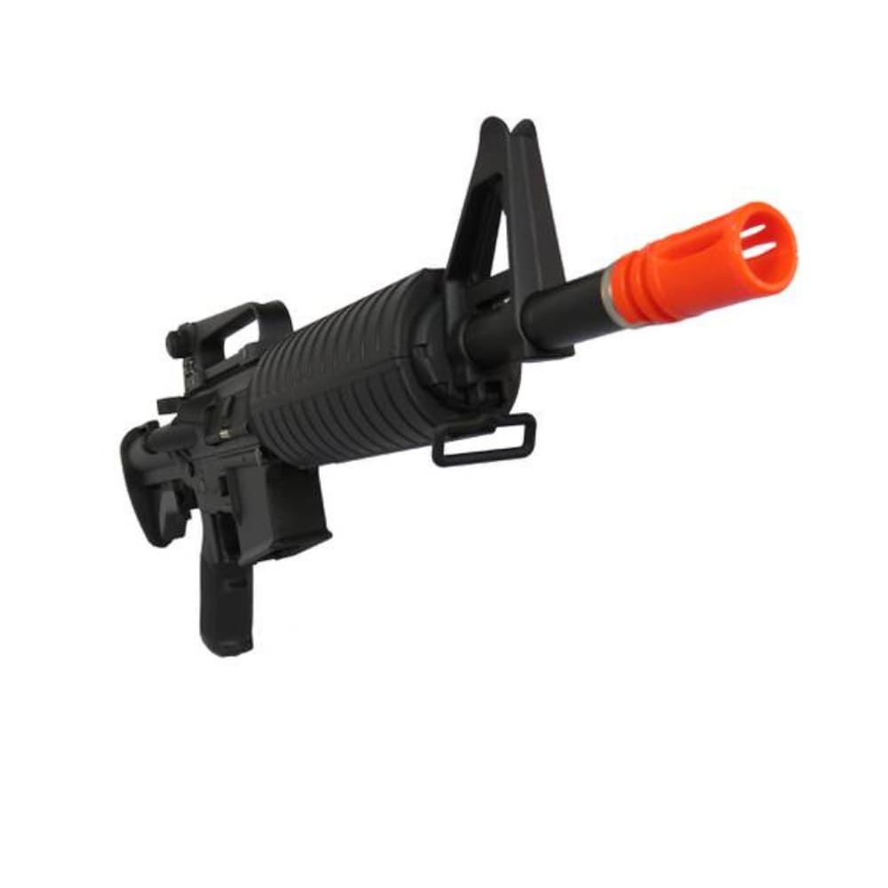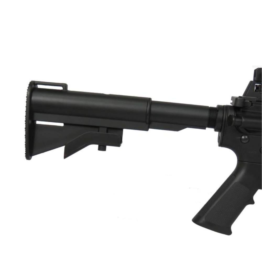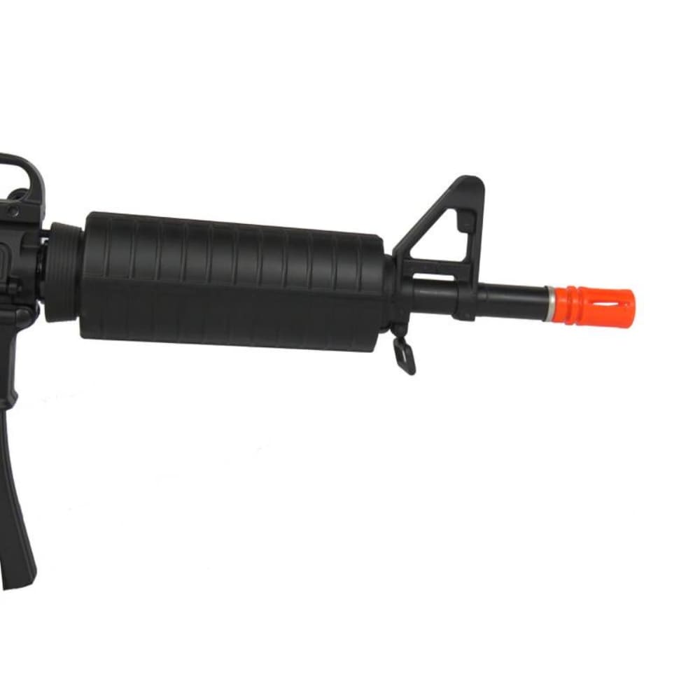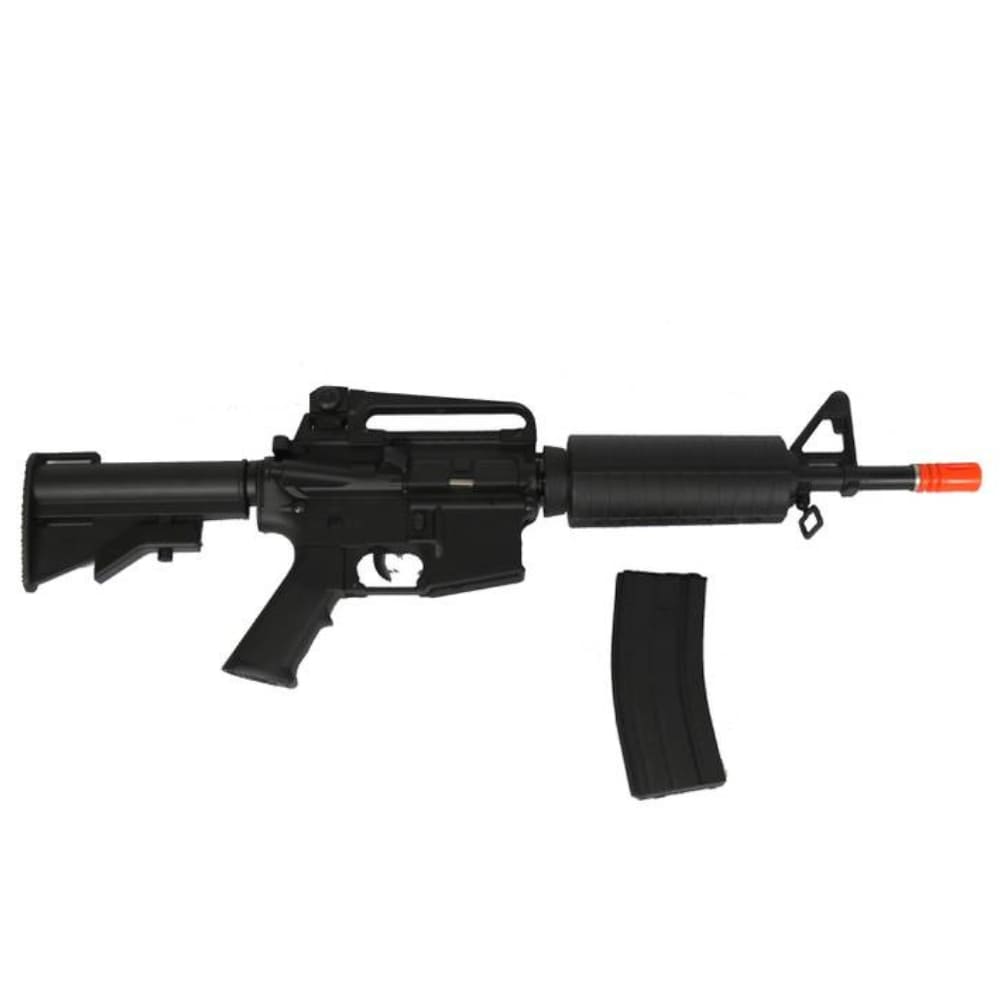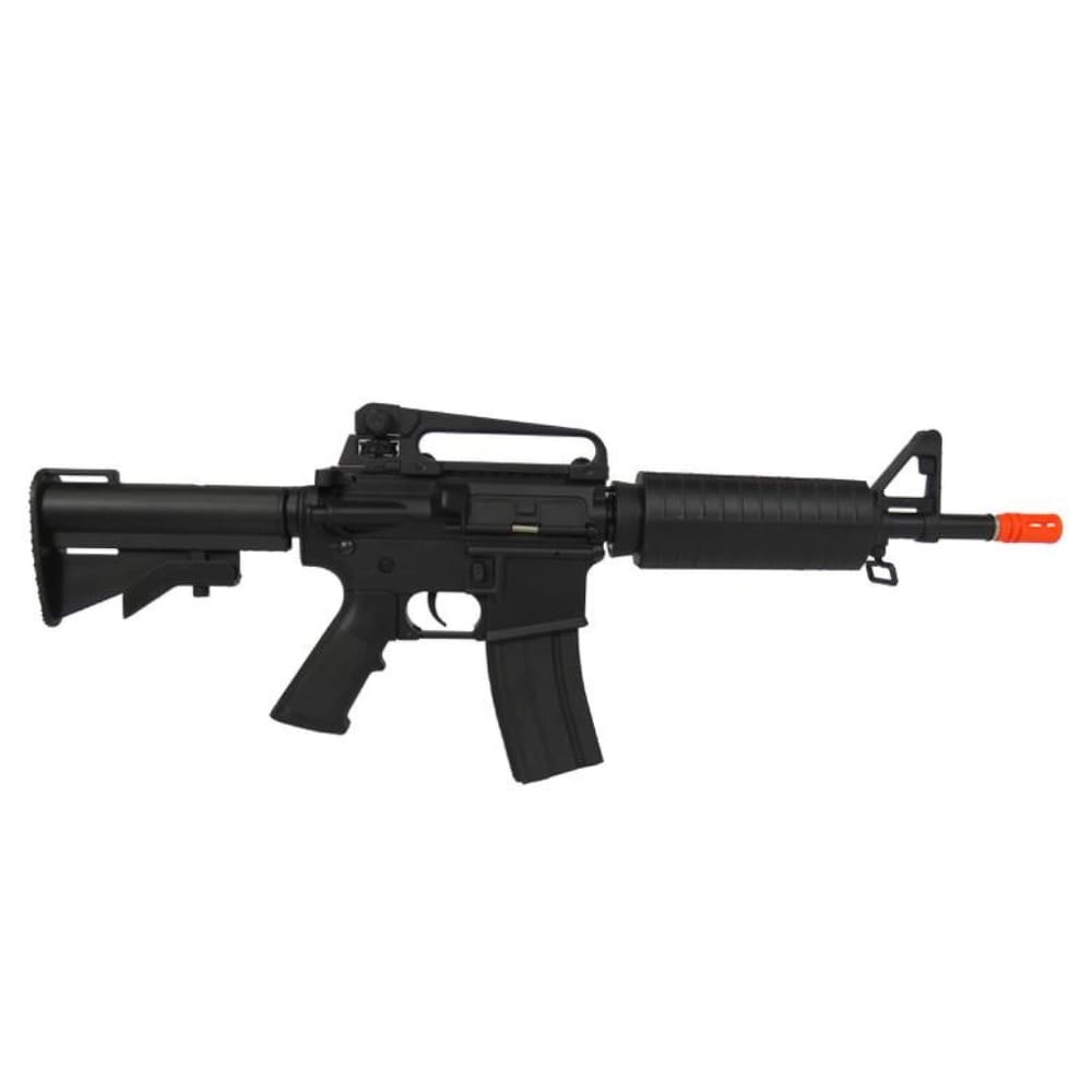 AEG M4 4005MG JG Works. Rifle Airsoft Elétrico M4 (AEG) fabricado pela Jing Gong (JG Works) em polímero, com alta resistência, durabilidade e força. Alcança velocidades de 370 FPS, variando de acordo com o peso da munição (BBs) utilizada. Pesa cerca de 2,5 kg e tem coronha ajustável, que vai de 69 a 78 cm dependendo do ajuste, possibilitando o uso da forma mais confortável para você. Possui Gearbox V2 e hop up ajustável que permite alterar o curso da BBs, ganhando maior precisão no disparo e alcance dependo do ajuste realizado. O magazine que acompanha é em metal com catraca e tem capacidade para até 300 BBs. Esse Rifle M4 na cor preta, conta com um carry handle fixo, que facilita o transporte. Alça de mira com ajuste e massa de mira fixa. A fiação da bateria está localizada no handguard do Rifle. Descrição: Marca: Jg Works Modelo: 4005MG Sistema de Funcionamento: AEG (Elétrica) Padrão interno: Gearbox V2 Material: Polímero ABS Cor: Preto FPS: 370 FPS (113 m/s) 0,20g Potência: 1,27 Joules Modo de disparo: Semi/Safe/Full Hop Up: Sim/Ajustável Comprimento com coronha retraída: 69 cm Comprimento com coronha estendida: 85,5 cm Peso: 2.485 gramas Dimensões com embalagem (AxCxL): 12x85x32 Peso com embalagem: 3.830 gramas Na embalagem contém: 01 – AEG M4 4005MG JG Works 01 – Magazine 300 BBs Garantia do vendedor: 90 dias