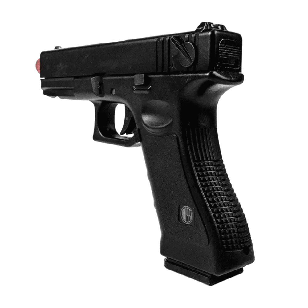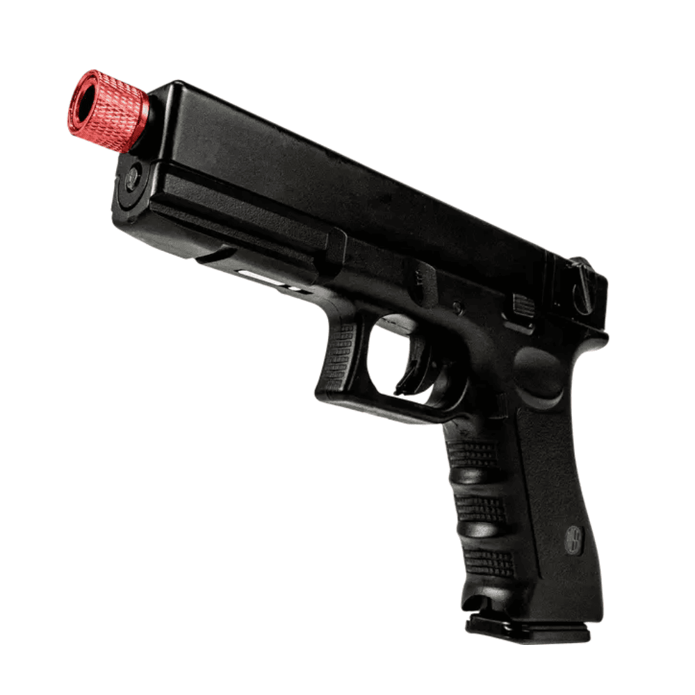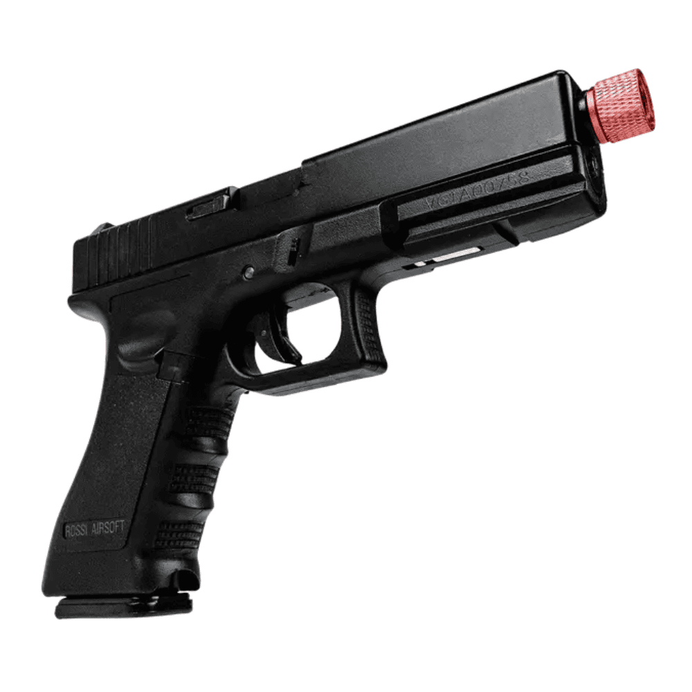 Adicionalmente, a pistola vem equipada com um trilho Picatinny de 22 mm, permitindo a adição de acessórios como lanternas ou lasers. A ponteira vermelha de metal com rosca de 14 mm é um detalhe de segurança importante. O modo de disparo semiautomático e automático, juntamente com o engatilhamento por ação do ferrolho (manual e blowback), oferecem versatilidade no uso. A pistola utiliza green gas como propulsor e vem com uma garantia de 3 meses, assegurando a qualidade e confiabilidade do produto.