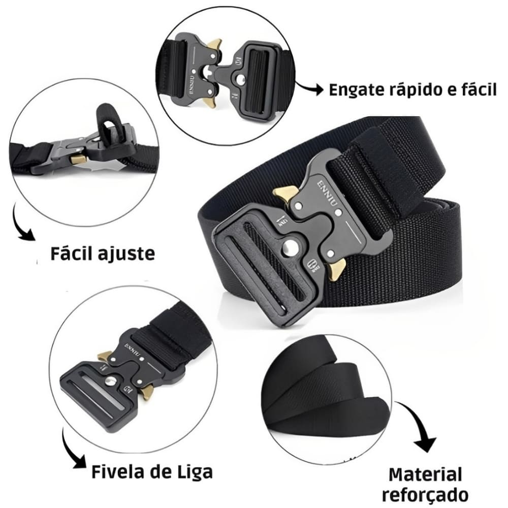 O cinto tem ótima qualidade, praticidade, estilo e segurança utilizando o sistema de engate/desengate rápido. Não possui furos, o que permite um ajuste mais adequado. Construído com material reforçado tem alta durabilidade e desempenho. Ideal para militares, policias, seguranças, praticantes de atividades ao ar livre, uso casual e etc.