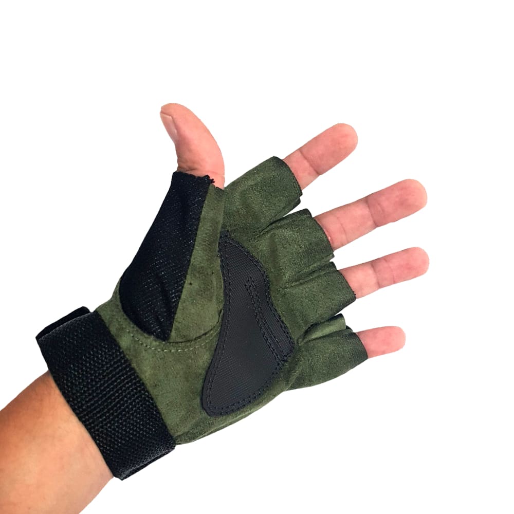 Empunhadura super resistente com ajustador em velcro, reforço no centro da mão, design: meio dedo