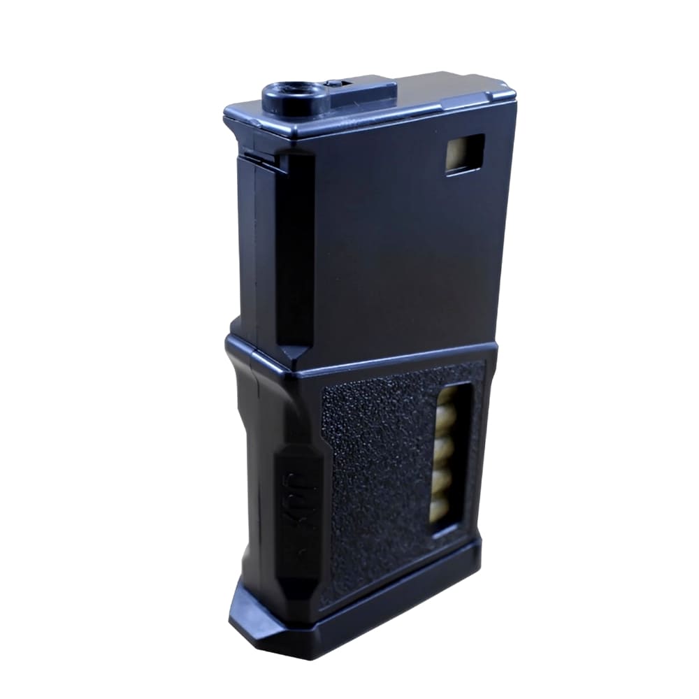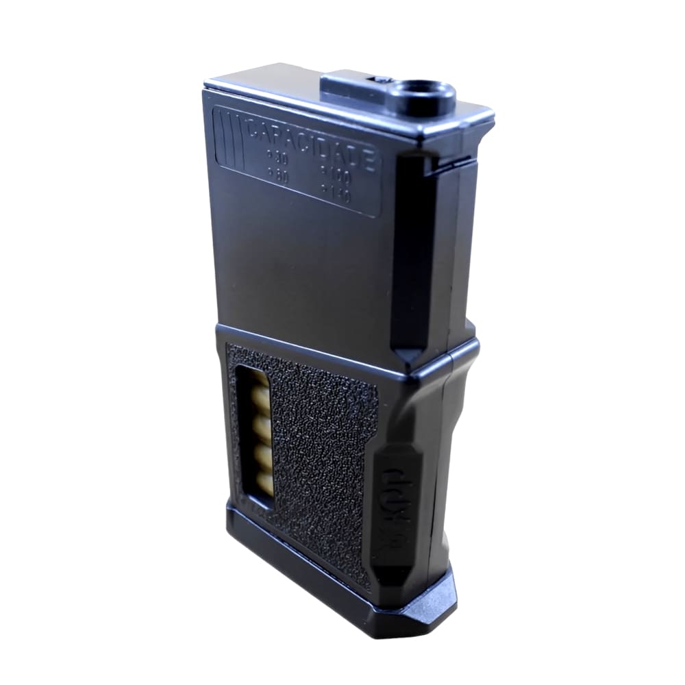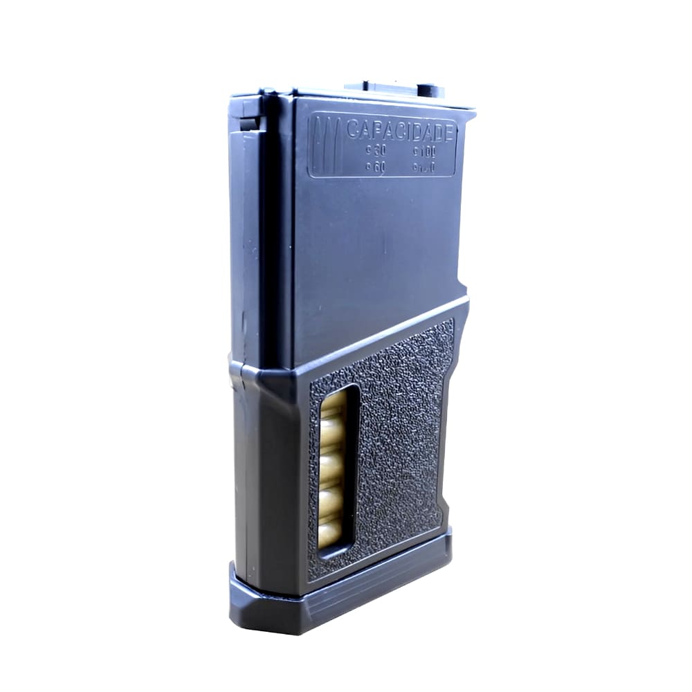 Fabricado no estilo “DMR” onde, o magazine é mais curto, a fim de ser utilizado em Aegs com bipé ou onde o operador estiver em posição deitado, este magazine, não fica “arrastando no chão”. Porém, não exclui a sua utilização em assault, speed entre outros.