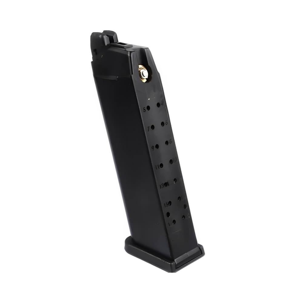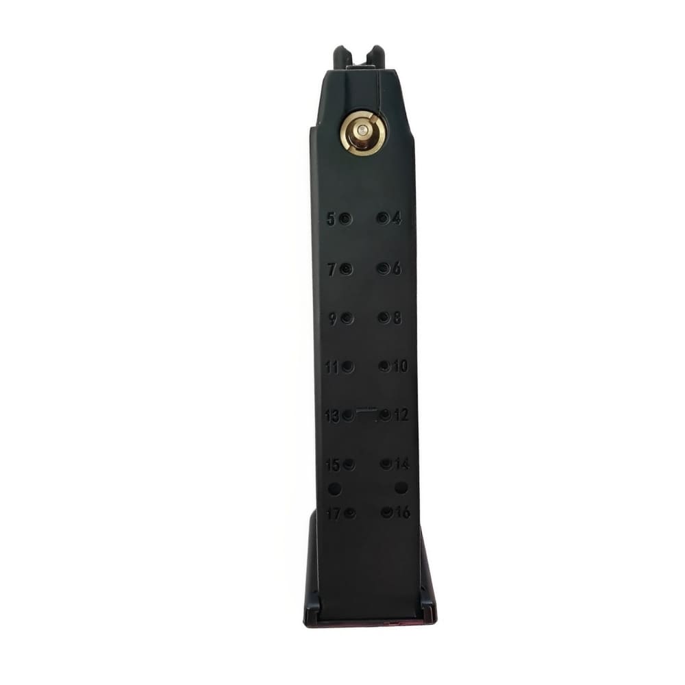 O Magazine Airsoft para Pistola R17 GBB tem capacidade para até 22bb’s. É compatível com a pistola Glock R17. Construído em metal e pesando 312g